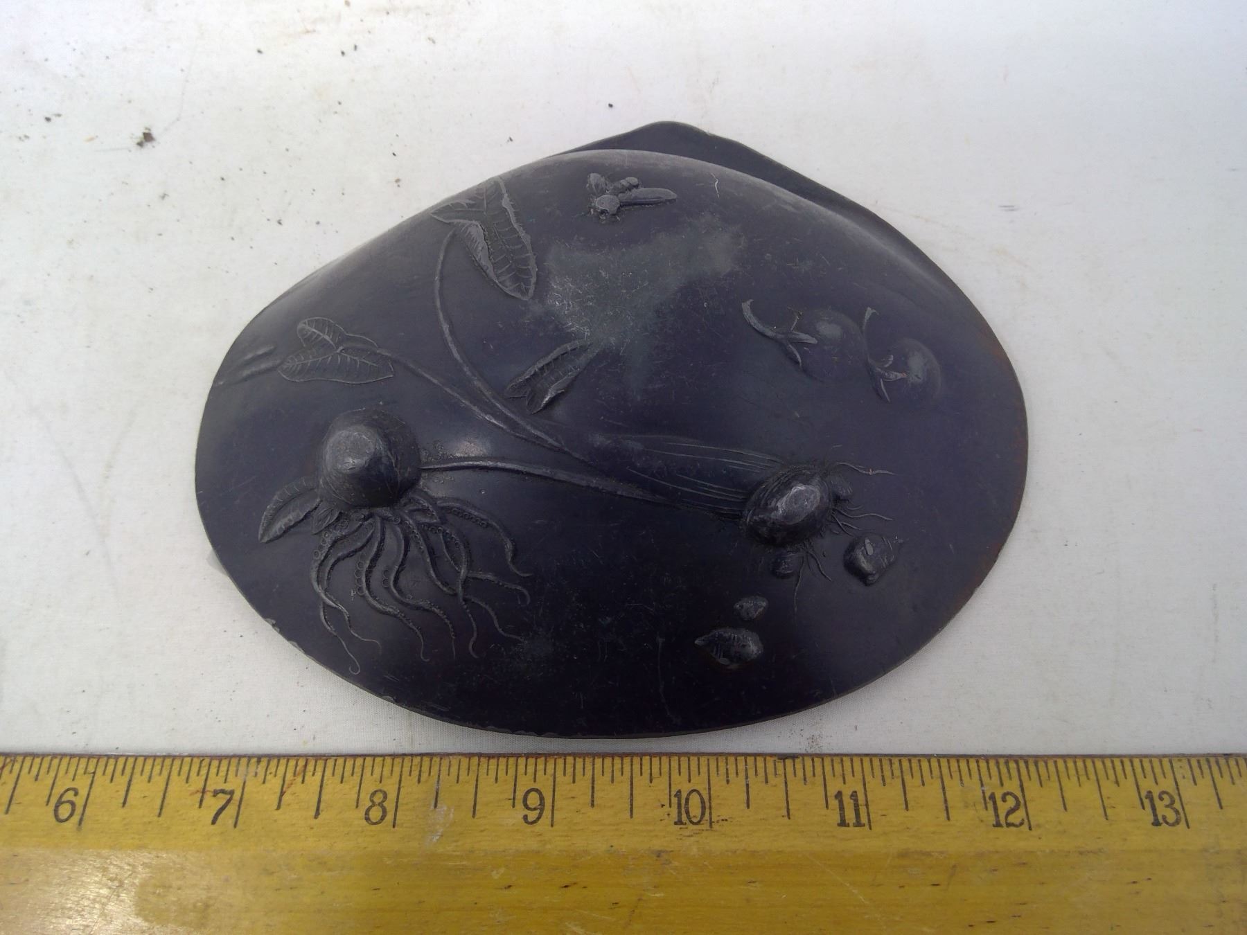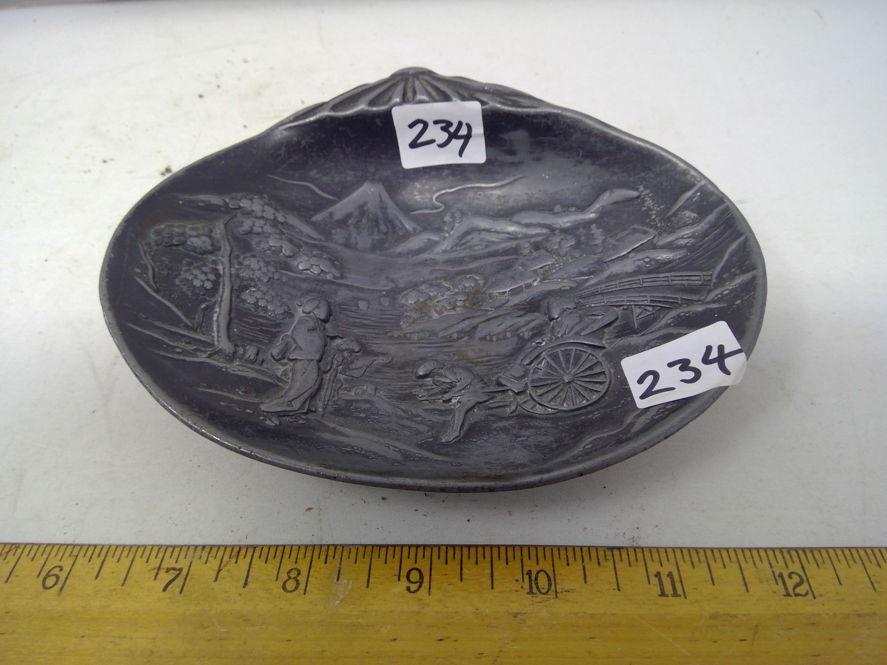 234 1840 Japan pewter dish with Mt. Fuji and rickshaw.
