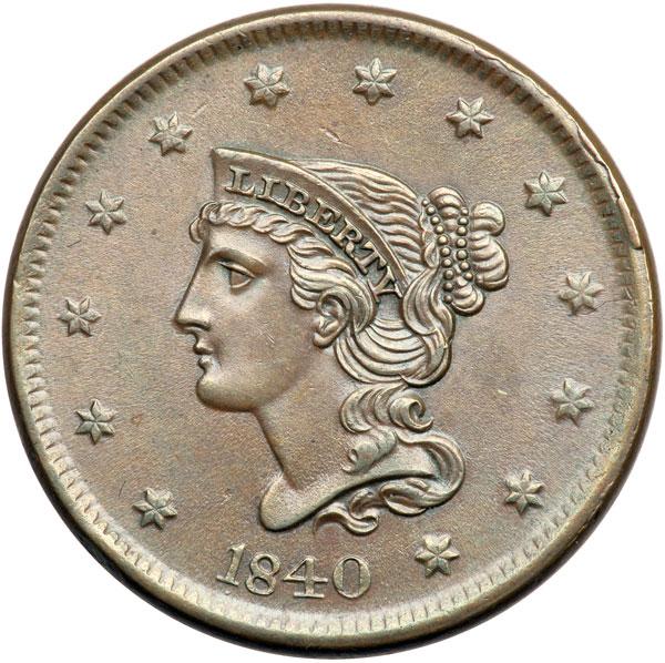 1840 N-10 R2 Large Date MS60. Lustrous medium steel brown with attractive, satiny surfaces. A tiny, barely visible rim bruise at star 1 and a faint scuff in the field off the chin, plus a very tiny planchet flake off the bust tip (as struck) are the notable marks, and all of them are trivial. LDS, die state d (Newcomb's old #11), with rim cud breaks at stars 8-12. The point of the curl over the 4 is sharp (from die polishing) Tied for CC#4 of only 5 known in mint state and tied for second finest of the later (Newcomb-11) die state. DWH #2216.