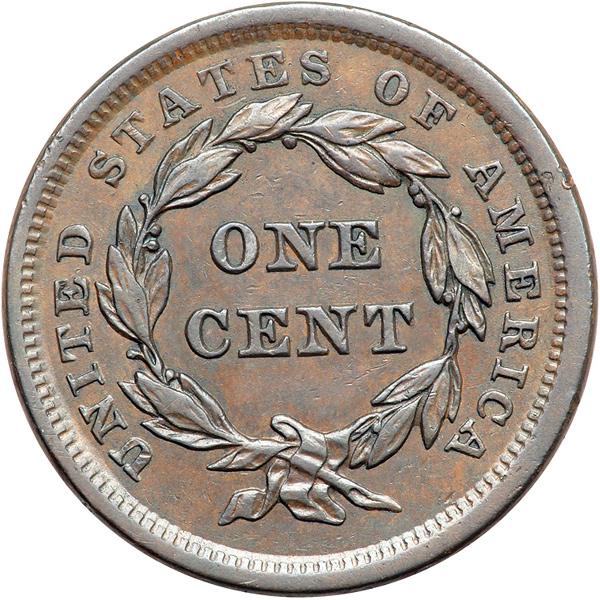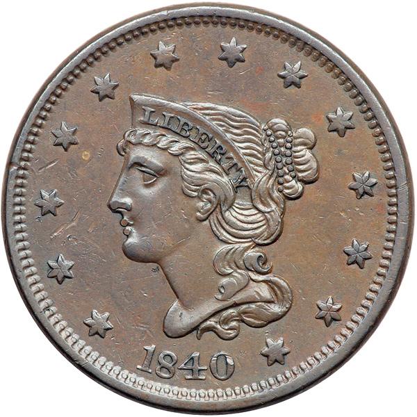 1840 N-10 R2. VF-30. Large Date. Slightly sharper but lightly cleaned and retoned chocolate and darker steel brown. A pinprick in the field at the throat and a collection of light contact marks in the field before the lips are the notable marks. Scarce EDS, die state a, with a dull line along the dentil tips over ERI in AMERICA.