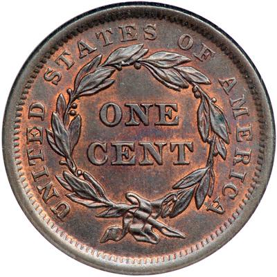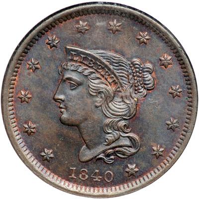 1840 N-12 R2. NGC graded MS-65 Brown. Small Date. Lustrous dark bluish steel brown with slightly faded mint red covering the protected areas on the obverse and 20% of the reverse. The surfaces are satiny and offer outstanding eye appeal. No spots or stains. The only marks are a few tiny ticks on the neck. M-LDS, die state b (Newcomb's old #13). Our grade is MS63. Tied for CC#1 with one other example, but this piece is the finest of the later N-13 die state.