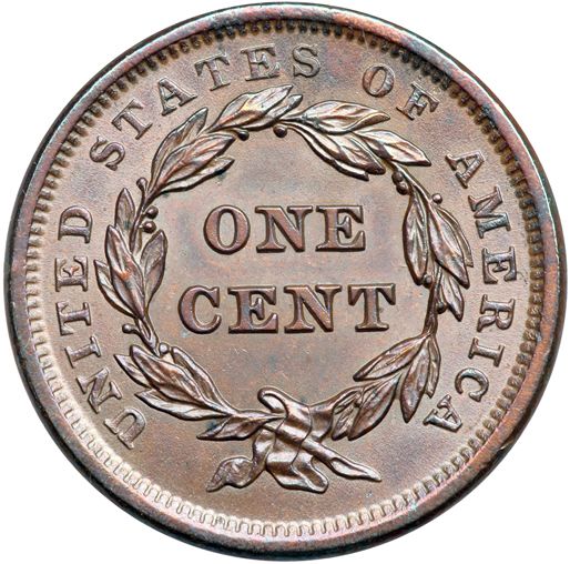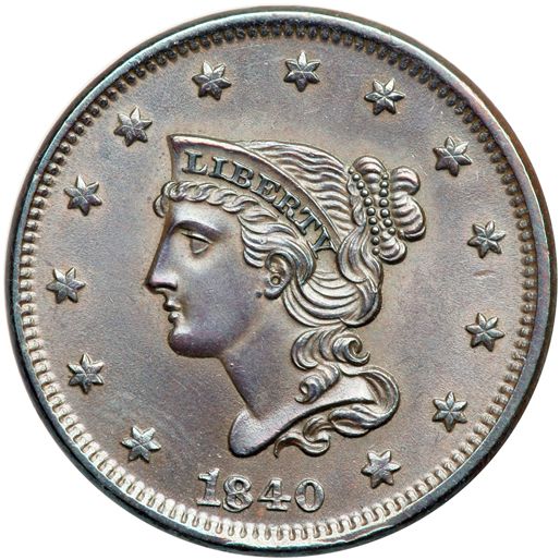 1840 N-2 R2 Small 18 over Large 18 MS60+. Lustrous steel brown and chocolate, the reverse a few shades lighter than the obverse. Satiny mint frost covers this very attractive cent. The reverse rim is a lighter shade of coppery steel brown in a few places and there is a splash of slightly darker toning over ES-O. Otherwise this cent is choice. A tiny rim nick over the second A in AMERICA can help identify this cent. MDS, die state b, showing a thin but clearly defined rim cud break under 840 to star 13. The Small 18 over Large 18 feature is bold.