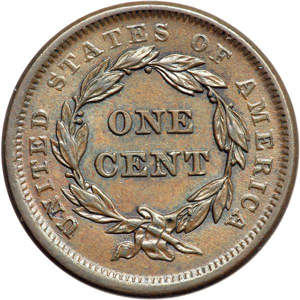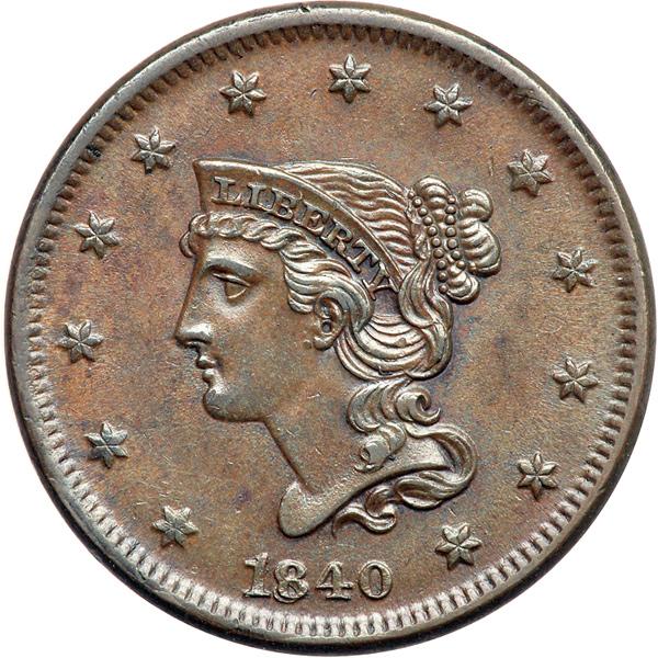 1840 N-2 R2 Small 18 over Large 18. AU-50. Choice lustrous steel brown and light chocolate. Great eye appeal, nearly flawless. The only marks are a light tick hidden in the hair well right of the earlobe and a tiny nick on the tip of the chin. Just a touch of rub on the highest points of the design. MDS, die state b. Fine radial die flowlines cover the fields and a thin, barely visible rim cud break is located under the 840. The Small 18 over Large 18 feature remains clear.