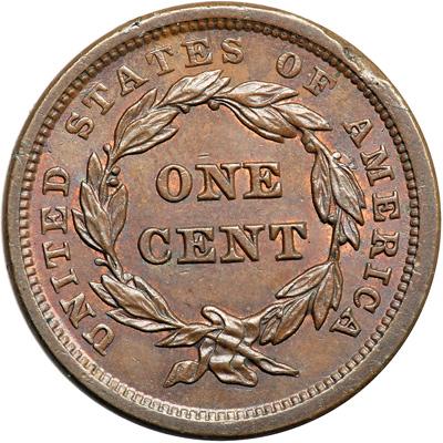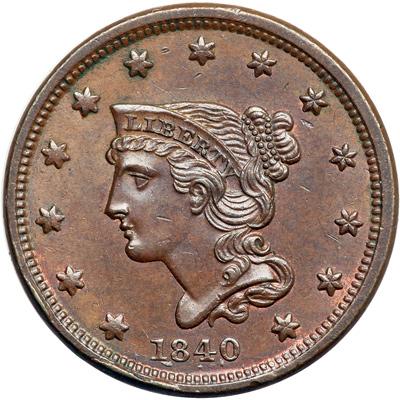 1840 N-4 R3. AU-55. Small Date. The so-called 40 over 39 overdate variety. Very close to mint state but there is a planchet void on the rim at OF-A where a small piece of the copper flaked away. Otherwise this cent offers outstanding eye appeal. Lustrous steel brown and light chocolate with generous traces of the original mint red remaining on both sides. Sharply struck E-MDS, die state a. The die defects under the date are bold (these lumps were once considered evidence of a 40 over 39 overdate) and there are several rim cud breaks from under the 18 clockwise to star 2.