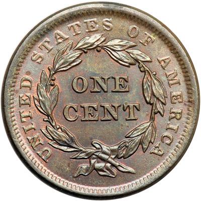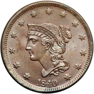 1840 N-5 R1. MS-62. Large Date. Lustrous light olive and bluish steel brown with traces of mint color on the obverse and 5% of the original red remaining on the reverse. Satiny mint luster covers the planchet and this cent would be choice if not for a faint swipe of reddish brown toning in the field before the nose. M-LDS, die state c. The recutting at the left top of the 0 in the date is faint and there are thin rim cud beaks at stars 1, 6, and 7. Tied for CC#8.