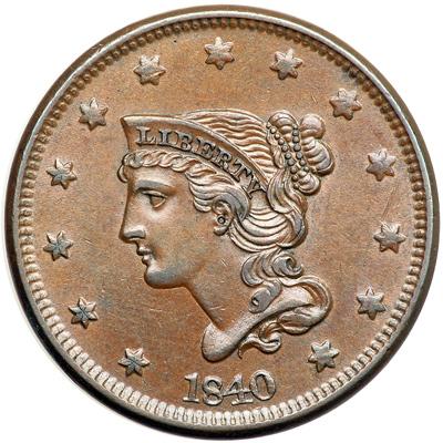 1840 N-6 R1. AU-55. Large Date with Repunched 40. Choice frosty light chocolate and steel brown. Virtually flawless, just a light touch of friction on the highest points of the design. MDS, die state b. The repunching on the 40 is clear.