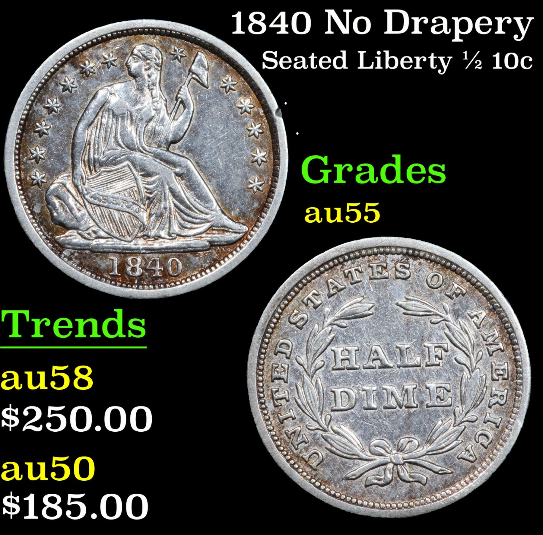 1840 No Drapery . . Seated Liberty Half Dime 1/2 10c Grades Choice AU.