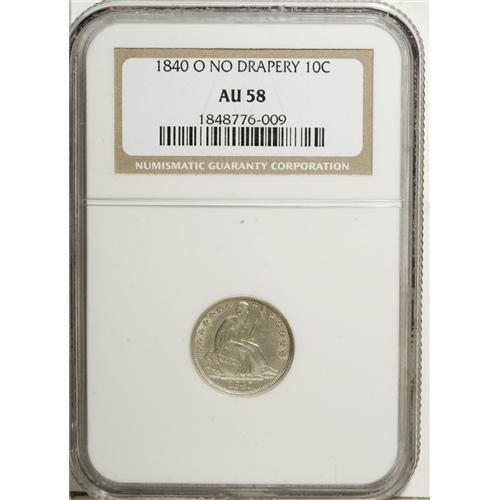 <B>1840-O 10C No Drapery AU58 NGC.</B></I> Pleasing silver-gray surfaces exhibit whispers of light tan color at portions of the borders, and retain considerable luster. The design elements are well impressed, manifesting itself in excellent definition in the star centers and Liberty's drapery.<BR><BR><b>Shipping:</b> Coin/Currency (<a target="_blank" href="http://www.heritageauctions.com/common/shipping.php">view shipping information</a>)