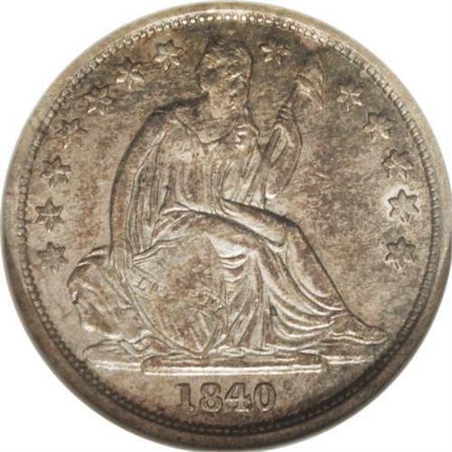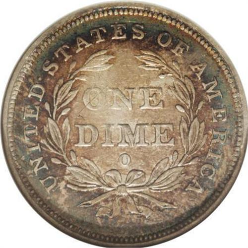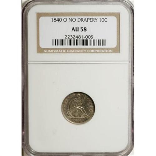<B>1840-O 10C No Drapery AU58 NGC.</B></I> Boldly struck, with considerable satin luster remaining, this coin's most noteworthy characteristic is its multicolored, speckled patina; this is deepest near the reverse periphery, where electric-green and russet shades are observed. Several wispy pinscratches occur on the upper reverse, one of which bisects the O in ONE. Conditionally scarce at this level and rare in Mint State. Census: 5 in 58, 6 finer (8/07). <BR><BR><B>Coin Engraver:</B> Christian Gobrecht<BR><BR><b>Shipping:</b> Coins & Currency (<a target="_blank" href="http://www.heritageauctions.com/common/shipping.php">view shipping information</a>)