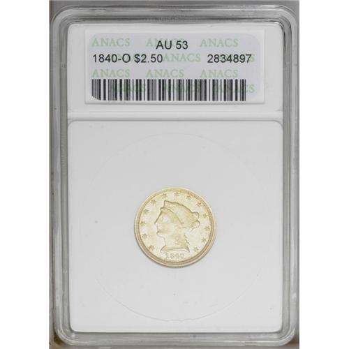 <B>1840-O<$2 1/2> AU53 ANACS.</B></I> Luster is extensive for the grade, and no relevant marks are located, but the centers are softly struck. A better date, since only 33,580 pieces were produced. <BR><BR><B>Important notice:</B> Heritage usually auctions material at the rate of 200-250 lots per hour. On some occasions eBay Live bid software or the Internet may not be able to keep up with the pace of the auction. We recommend placing a realistic absentee bid now as insurance to avoid disappointment. Occasionally the auctioneer may eliminate or reject an eBay Live bid, and the auctioneer may also reopen a lot after the close of the eBay live bidding (usually because we missed an audience bid), and may reject your bid even if it shows you as the winning bidder. By bidding via eBay Live, you agree that Heritage may award the lot to another bidder at its sole discretion under the circumstances described above or any other reasonable circumstances. Since eBay bids are not shown to us until we open the lot on the floor, we treat those bids just like floor bids. In most cases the floor responds before the eBay bid is presented to us, due to Internet lag time, so for consistency we have made it a policy that floor bids are always considered first over tie eBay live bids. Also please note that all Heritage lots purchased through eBay Live carry a 20% Buyer's Premium. Please make sure you read the Terms and Conditions before you bid. This lot is being auctioned in conjunction with a live floor auction by Heritage Galleries & Auctioneers. All final auction and invoice information will be supplied by Heritage Galleries & Auctioneers, and all other information should be considered preliminary. Lot:2355 <BR><BR><B>Winning Notification and Billing:</B> After the FINAL session in this auction is complete, Heritage will send e-mail and snail mail invoices. This process normally takes several days. All final auction and invoice information will be supplied by Heritage Galleries & Auctioneers, and all other information should be considered preliminary. <BR><BR>This auction will be conducted on a live auction floor and over the Internet through eBay Live. If you choose to place an absentee bid, please take a moment to <font color='#0000ff'><u><a href='http://pages.ebay.com/liveauctions/help/before/laabsentee.html'>learn how eBay Live absentee bidding works</a></u></font><font color='#000000'>