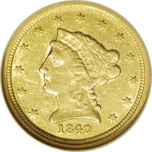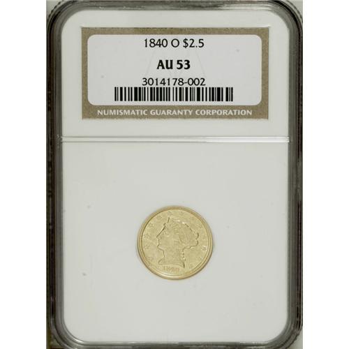 <B>1840-O $2 1/2 AU53 NGC.</B></I> The first Liberty Head quarter eagles were coined in 1840, although the design had actually been used for half eagles since 1839 and eagles since 1838. This piece displays a typical strike with weak obverse details and even weaker reverse details, yet it is attractive with bright green gold surfaces and nearly full luster.<BR><BR><b>Shipping:</b> Coin/Currency (<a target="_blank" href="http://www.heritageauctions.com/common/shipping.php">view shipping information</a>)