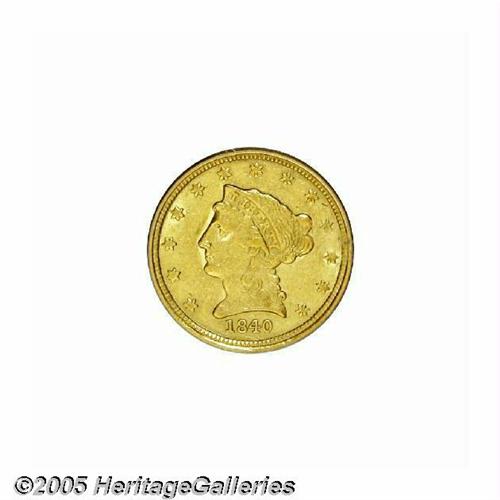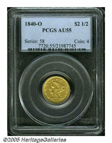 <B>1840-O<$2 1/2> AU55 PCGS.</B></I> Large Mintmark. A challenging early O-mint issue both in terms of total numbers and from a condition perspective. The original mintage of 33,500 pieces includes both small and large mintmark varieties. This solid AU example combines green-gold alloy with natural reddish patina. The strike is expectantly deficient over the central devices and a few of the obverse stars. Population: 6 in 55, 17 finer (6/05).