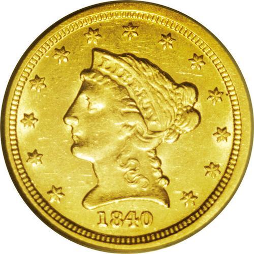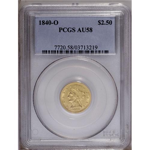 <B>1840-O $2 1/2 AU58 PCGS.</B></I> Mostly brilliant surfaces are highlighted by blushes of lemon-gold. Much original mint luster still survives around the stars, letters, numerals, and other design elements. Softly struck in areas; most prominently on the eagle's right leg (viewer's left) and his neck. The 1840-O has a moderately small mintage of 33,580 pieces, but really wasn't appreciated in the upper echelons of condition until David Akers wrote his <I>United States Gold Coins: An Analysis of Auction Records</B></I> series. The volume on quarter eagles appeared in 1975. Akers recognized the 1840-O as being scarce in all grades and an important rarity above the XF level, a perception that is still borne out today by the population report data published by the major grading services. Population: 7 in 58, 10 finer (12/05).