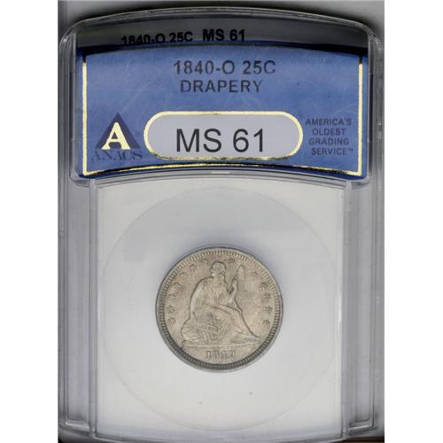 1840-O 25C Drapery MS61 ANACS. This low mintage (43,00 1840-O[25C] Drapery MS61 ANACS.