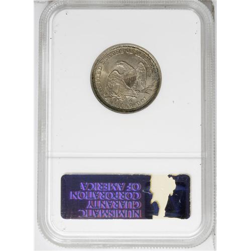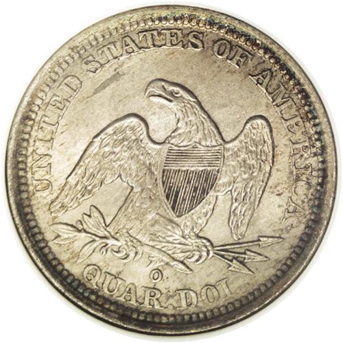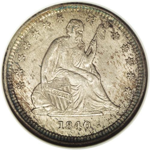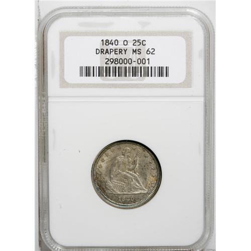 <B>1840-O<25C> Drapery MS62 NGC.</B></I> This is a splendid Mint State example with sharp design elements and fully lustrous surfaces beneath pale gold toning and speckled iridescence. A few minor surface marks can be seen on each side. This example is almost certainly from the New Orleans Hoard, discovered in the French Quarter in October 1982.