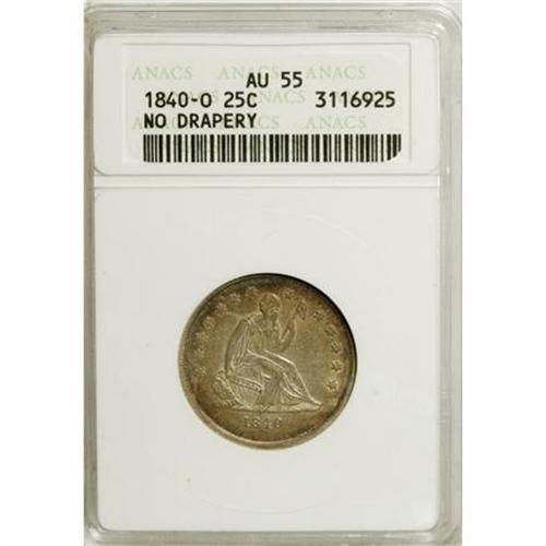 <B>1840-O 25C No Drapery AU55 ANACS.</B></I> Briggs 1-A. The mintmark is bold and entered left relative to the other No Drapery marriage, Briggs 2-B. The 8 in the date is lightly repunched. Autumn-brown and aqua-blue borders frame the dusky gray centers. Nicely struck and partially lustrous.<BR><BR><b>Shipping:</b> Coins & Currency (<a target="_blank" href="http://www.heritageauctions.com/common/shipping.php">view shipping information</a>)
