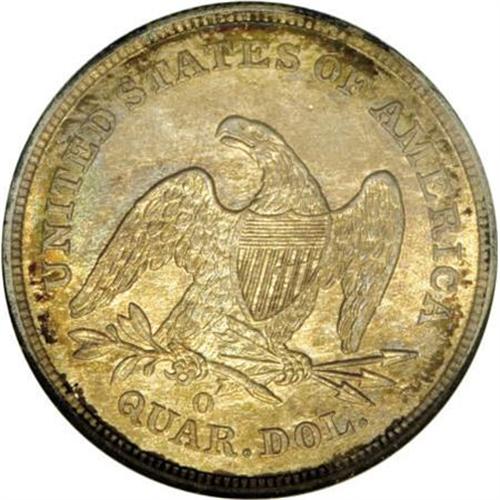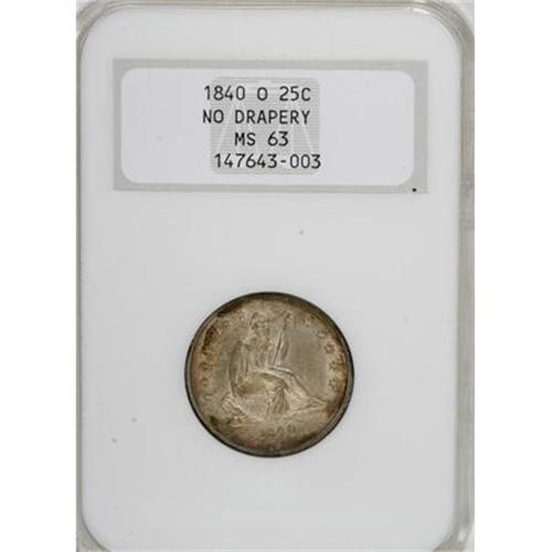 <B>1840-O 25C No Drapery MS63 NGC.</B></I> The 1838, 1839, and the 1840-O are the only three issues contained in the short-lived Seated quarter series that do not show extra drapery folds at Liberty's right (facing) elbow. Original autumn-brown and forest-green patina deepens toward the margins. The striking details are well defined in all areas, including the often-weak neck of the eagle. One of the most impressive 1840-O No Drapery quarters we have handled, regardless of grade. Housed in an early generation holder. Census: 5 in 63, 6 finer (8/07).<BR><I>From The Beau Clerc Collection.</B></I><BR><BR><B>Coin Engraver:</B> Christian Gobrecht<BR><BR><b>Shipping:</b> Coins & Currency (<a target="_blank" href="http://www.heritageauctions.com/common/shipping.php">view shipping information</a>)