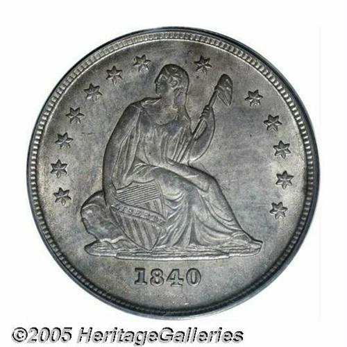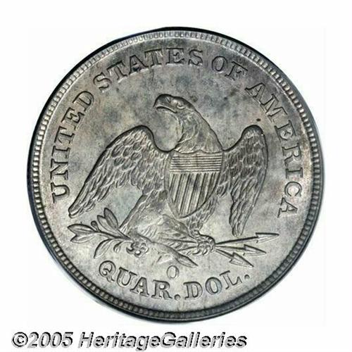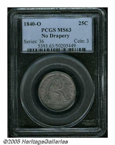 <B>1840-O<25C> No Drapery MS63 PCGS.</B></I> Only three issues in as many years make up the No Drapery type, and one always suspects that any high grade '40-O must have been salvaged from the mud of the Hotel Meridien in New Orleans in 1982. This is a relatively well defined coin that shows evidence of having been struck from a worn die as evidenced by the slight softness of details over the highpoints of the design as well as the flow lines around the margins. Lightly abraded with the usual satin-like mint luster, both sides show a moderate amount of steel-gray toning with a slight pinkish-rose overlay of color. Population: 5 in 63, 1 finer (5/05).