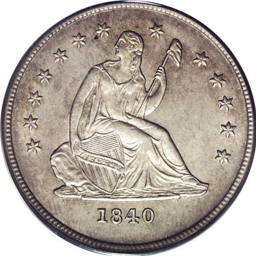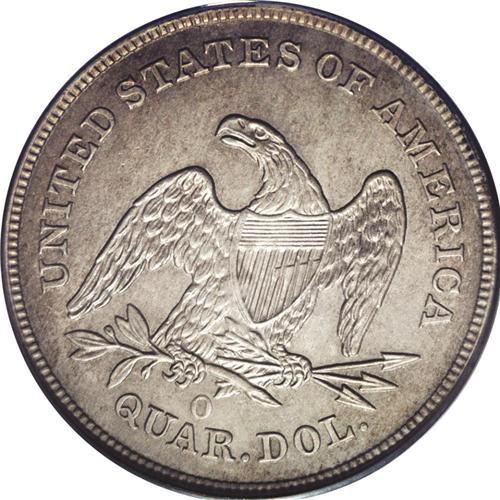 <B>1840-O<25C> No Drapery MS64 PCGS.</B></I> Christian Gobrecht's Seated Liberty Quarter made its debut in 1838 with a mintage of 466,000 pieces. The Philadelphia Mint produced a further 491,146 coins in 1839, followed by the New Orleans Mint's initial delivery of 382,200 pieces in 1840. These three issues are unique in that they are the only coins in the Seated Quarter series that do not show extra drapery folds at Liberty's right (facing ) elbow. The 1840-O No Drapery is even more distinct from the 1838 and 1839 in that the denticles on the obverse are small and, in some cases essentially non-existent. This feature results in greater field area around Liberty's portrait and the peripheral star. The present golden-gray piece offers subtle satin luster across the lightly marked fields. The strike is crisp and lacks the often-seen softness of detail over the star centrils, Liberty's head, and the eagle's claws. For pedigree purposes, we mention a small spot near star 7. This is the finest PCGS-certified example of this scarce issue. Population: 1 in 64, 0 finer (6/06).
