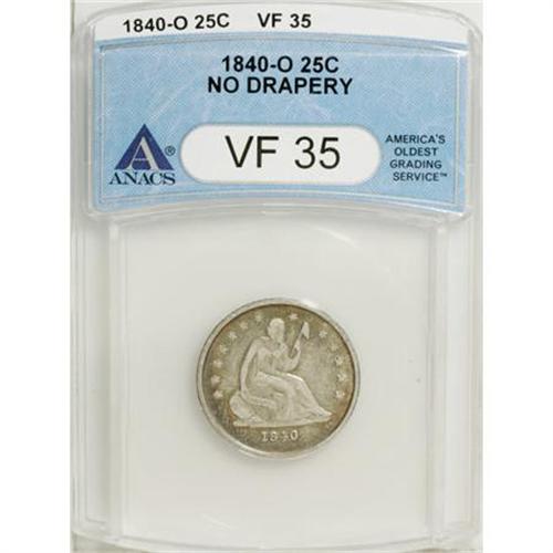 <B>1840-O 25C No Drapery VF35 ANACS.</B></I> NGC Census: (1/80). PCGS Population (4/51). Mintage: 382,200. Numismedia Wsl. Price for NGC/PCGS coin in VF35: $289. (#5393)<BR><BR><B>Coin Engraver:</B> Christian Gobrecht<BR><BR><b>Shipping:</b> Coins & Currency (<a target="_blank" href="http://www.heritageauctions.com/common/shipping.php">view shipping information</a>)
