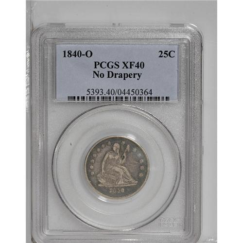 <B>1840-O<25C> No Drapery XF40 PCGS.</B></I> Toned dove-gray in the center with pewter-gray patina at the periphery. This evenly worn coin has quite respectable eye appeal.