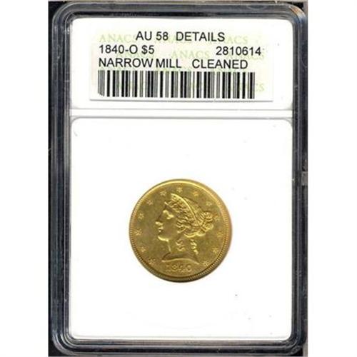 <b>1840-O $5 Liberty. ANACS graded AU58 Details Cleaned.</b> Only 40,120 pieces were struck for this early half eagle which is also he first year which New Orleans issued half eagles. This coin is boldly struck with remaining luster. The obverse and reverse have been brushed (as per the cleaning remark by ANACS) <b>(PCGS # 8200)</b>