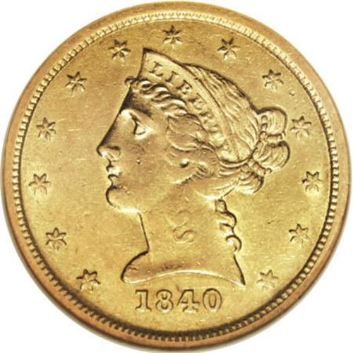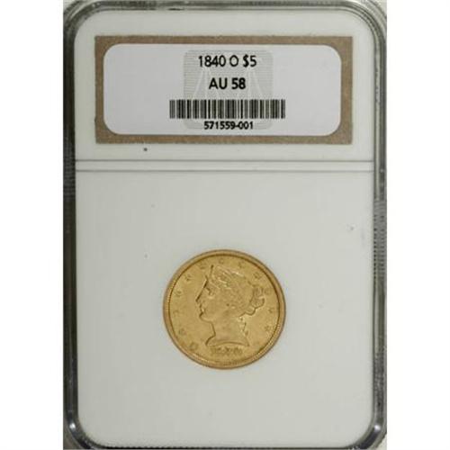 <B>1840-O $5 Narrow Mill AU58 NGC.</B></I> The Narrow Mill is the more common of the two varieties. This high-end About Uncirculated New Orleans Mint specimen possesses ample luster residing on peach-gold, minimally abraded surfaces. A sharp strike translates into good definition on the design elements, except for the usually seen softness in the centers.<BR><BR><B>Coin Engraver:</B> Christian Gobrecht<BR><BR><b>Shipping:</b> Coins & Currency (<a target="_blank" href="http://www.heritageauctions.com/common/shipping.php">view shipping information</a>)