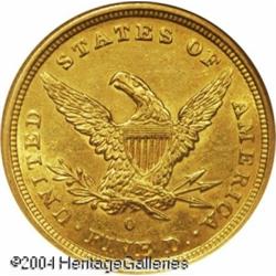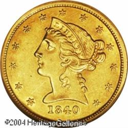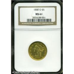 1840-O $5 Narrow Mill MS61 NGC. The more commonly <B>1840-O $5 Narrow Mill MS61 NGC.</B></I> The more commonly seen of the two varieties, the Narrow Mill O-mints of 1840 are among the best struck of all branch mint issues of this year. However, the centers are somewhat flat, as usual, but the margins are well defined. The coin has a pleasing reddish-gold color, but the luster is too subdued for a finer grade. There are no singularly mentionable abrasions. Population: 5 in 61, 4 finer (10/04). <BR><BR><B>Important notice:</B> Heritage usually auctions material at the rate of 200-250 lots per hour. On some occasions eBay Live bid software or the Internet may not be able to keep up with the pace of the auction. We recommend placing a realistic absentee bid now as insurance to avoid disappointment. Occasionally the auctioneer may eliminate or reject an eBay Live bid, and the auctioneer may also reopen a lot after the close of the eBay live bidding (usually because we missed an audience bid), and may reject your bid even if it shows you as the winning bidder. By bidding via eBay Live, you agree that Heritage may award the lot to another bidder at its sole discretion under the circumstances described above or any other reasonable circumstances. Since eBay bids are not shown to us until we open the lot on the floor, we treat those bids just like floor bids. In most cases the floor responds before the eBay bid is presented to us, due to Internet lag time, so for consistency we have made it a policy that floor bids are always considered first over tie eBay live bids. Also please note that all Heritage lots purchased through eBay Live carry a 20% Buyer's Premium. Please make sure you read the Terms and Conditions before you bid. This lot is being auctioned in conjunction with a live floor auction by Heritage Galleries & Auctioneers. All final auction and invoice information will be supplied by Heritage Galleries & Auctioneers, and all other information should be considered preliminary. Lot:6637