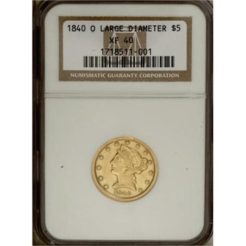 <B>1840-O $5 Large Diameter XF40 NGC.</B></I> NGC Census: (9/121). PCGS Population (19/53). Mintage: 40,120. Numismedia Wsl. Price for NGC/PCGS coin in XF40: $690. (#8200)<BR><BR><B>Coin Engraver:</B> Christian Gobrecht<BR><BR><b>Shipping:</b> Coins & Currency (<a target="_blank" href="http://www.heritageauctions.com/common/shipping.php">view shipping information</a>)