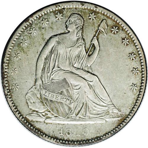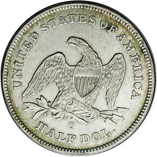<B>1840-O<50C> AU53 NGC.</B></I> WB-104. Large O mintmark, one of three different sizes in use at New Orleans that year. This sharply struck example displays olive and stone-gray color, and no obtrusive marks are present. A few specks of charcoal patina near OF do not distract.