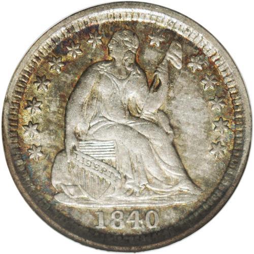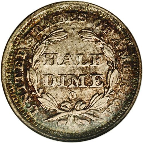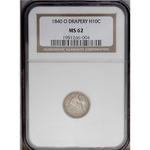 <B>1840-O<H10C> Drapery MS62 NGC.</B></I> The 1840-O With Drapery is somewhat elusive in Mint State, with only about 30 coins certified by NGC and PCGS. The MS62 specimen offered in this lot displays slightly subdued surfaces bathed in reddish-gold and electric-blue toning, and all of the design elements are adequately brought up. A miniscule mark is seen on Liberty's left hand, and a couple of more in the upper reverse field. Census: 3 in 62, 0 finer (2/06).
