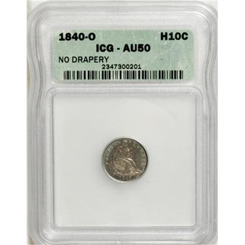<B>1840-O H10C No Drapery AU50 ICG.</B></I> V-6, Open Bud Reverse. NGC Census: (2/32). PCGS Population (3/25). Mintage: 695,000. Numismedia Wsl. Price for NGC/PCGS coin in AU50: $196. (#4322)<BR><BR><B>Coin Engraver:</B> Christian Gobrecht<BR><BR><b>Shipping:</b> Coins & Currency (<a target="_blank" href="http://www.heritageauctions.com/common/shipping.php">view shipping information</a>)