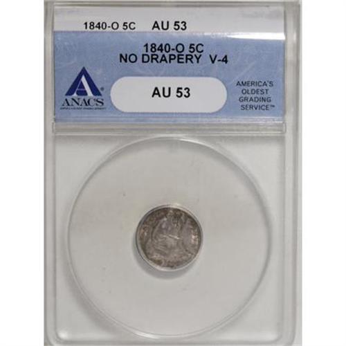 <B>1840-O H10C No Drapery AU53 ANACS.</B></I> V-4. Small O. This Valentine variety has a prominently recut star 5. The crossbar of the 4 is repunched widely south. The reverse has numerous spindly die cracks, including three that converge on the mintmark. Sea-green, gold, and stone-gray toning with moderate friction on the seated Liberty.<BR><I>From The Al Blythe Collection of Half Dimes.</B></I><BR><BR><B>Coin Engraver:</B> Christian Gobrecht<BR><BR><b>Shipping:</b> Coins & Currency (<a target="_blank" href="http://www.heritageauctions.com/common/shipping.php">view shipping information</a>)