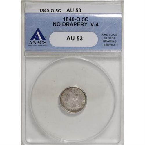 <B>1840-O H10C No Drapery AU53 ANACS.</B></I> V-4a. Small O. Incorrectly listed as V-4 by ANACS, but that variety has a widely recut star 5. The crossbar of the 4 is repunched south, but the spread is less than on V-4. The central strike is slightly soft, and a few subdued marks are present near star 12.<BR><I>From The Al Blythe Collection of Half Dimes.</B></I><BR><BR><B>Coin Engraver:</B> Christian Gobrecht<BR><BR><b>Shipping:</b> Coins & Currency (<a target="_blank" href="http://www.heritageauctions.com/common/shipping.php">view shipping information</a>)