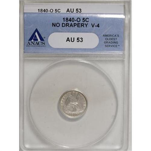 <B>1840-O H10C No Drapery AU53 ANACS.</B></I> V-4a. Small O. Inaccurately designated as V-4 on the ANACS insert. Nicely struck aside from Liberty's head and the left wreath bow. The unabraded surfaces display ample luster.<BR><I>From The Al Blythe Collection of Half Dimes.</B></I><BR><BR><B>Coin Engraver:</B> Christian Gobrecht<BR><BR><b>Shipping:</b> Coins & Currency (<a target="_blank" href="http://www.heritageauctions.com/common/shipping.php">view shipping information</a>)