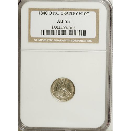 <B>1840-O H10C No Drapery AU55 NGC.</B></I> Light gold patina visits this partially lustrous and nicely struck New Orleans type coin. A faint gray toning streak is noted to the right of the pole. Struck from multiply clashed dies.<BR><BR><b>Shipping:</b> Coins & Currency (<a target="_blank" href="http://www.heritageauctions.com/common/shipping.php">view shipping information</a>)