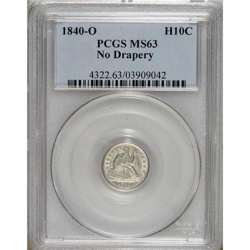 <B>1840-O H10C No Drapery MS63 PCGS.</B></I> V-3. Small Round O. This example shows heavy die clashing and diagnostic die cracks along the reverse border. Essentially untoned with satin luster and some definite waviness just to the right of center on both sides. The obverse dentils and the wreath bow are very mushy. Distracting marks are not seen on either side, however. Population: 5 in 63, 4 finer (3/07).<BR><BR><b>Shipping:</b> Coins & Currency (<a target="_blank" href="http://www.heritageauctions.com/common/shipping.php">view shipping information</a>)