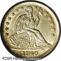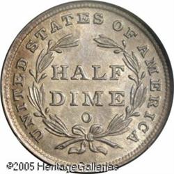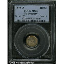 <B>1840-O H10C No Drapery MS64 PCGS.</B></I> The 1840-O No Drapery Half Dime is overshadowed by its more challenging Drapery counterpart, but in actuality is an issue that seldom appears in Uncirculated. This satiny Mint State representative displays excellent sharpness throughout and is tinged in lilac and lemon-yellow patina. Population: 4 in 64, 0 finer (1/05). Lot:6119
