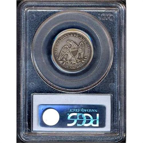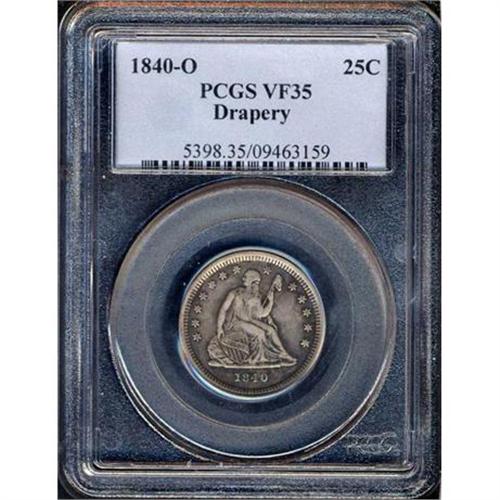 <b>1840-O Liberty Seated Quarter Dollar. Drapery. PCGS graded VF35.</b> Light silvery gray with deeper accents of steel and charcoal gray at the main devices. The mint hired Robert Ball Hughes to modify Gobrecht's seated Liberty figure in 1840, with this "With Drapery" piece being the result. Scarce in all grades since the entire coinage of the Type comprised only 43,000 pieces versus over 382,000 of the No Drapery style <b>(PCGS # 5398)</b>
