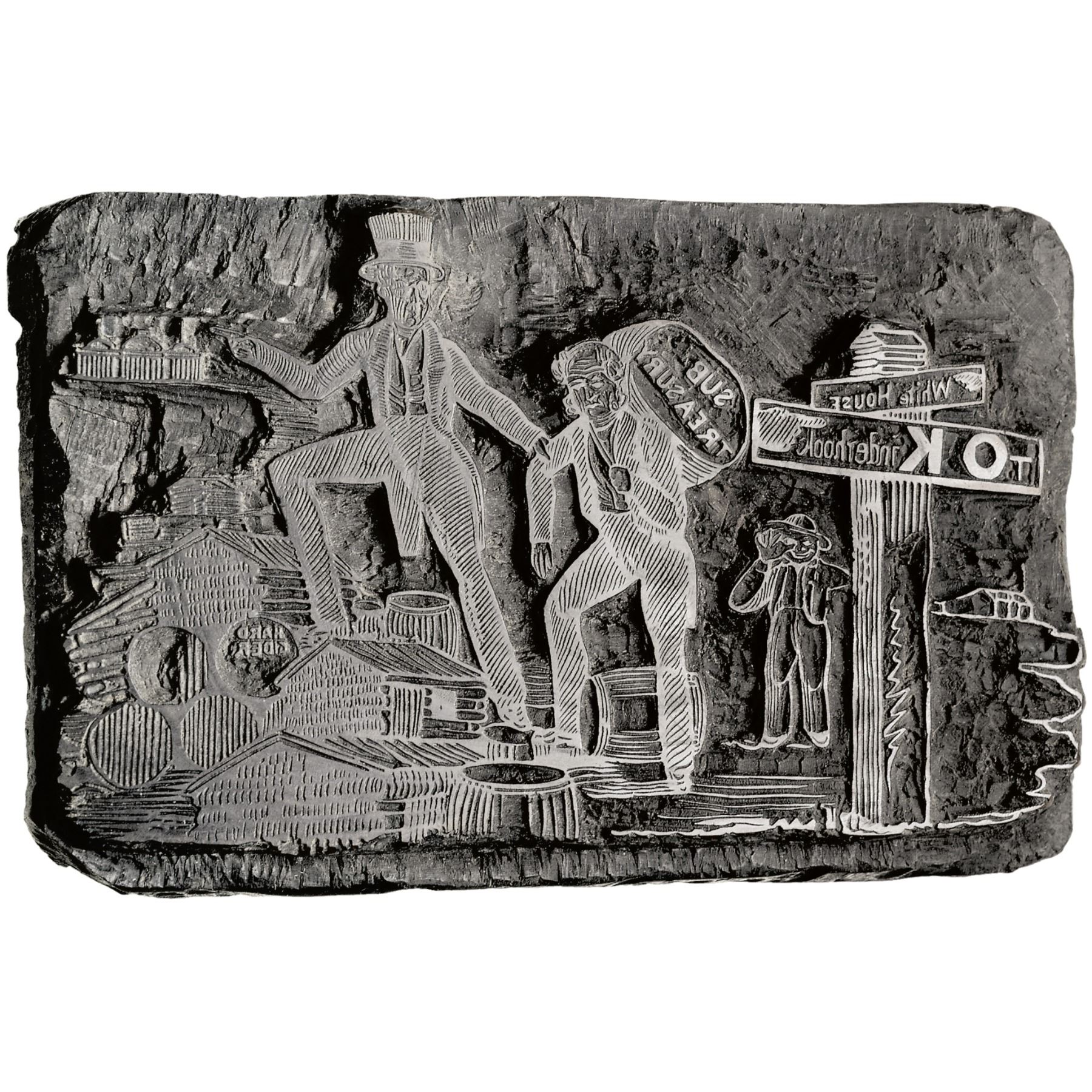Original, 2.75” x 4.25” x 1/2” Woodblock Printing Plate which illustrates the 1840s origin of the American term “OK”-- which was derived from “Old Kinderhook”. This was Martin Van Buren’s nickname, based on his birthplace in Upstate New York. In this Woodcut, Martin Van Buren carries on his back his “Subtreasury Bill,” which had been adopted by Congress in 1840 during the presidential campaign. He is led by former President Andrew Jackson, as they walk towards the White House, scaling log cabins and barrels of “hard cider” (the symbols of William Henry Harrison’s campaign). In the distance is the Capitol, and towards the left is Van Buren’s home in New York. A signpost points “To Kinderhook” (to the left) and “White House” (to the right). Before 1840, OK was an abbreviation for “all correct” and was also used by Van Buren during his 1840 campaign. This woodblock is in excellent condition, being a splendid example of an early political campaign woodcut and political illustration. This political illustration was printed with a caption: “A Hard Road To Hoe! Or, the White House Turnpike, macadamized by the North Benders. Sold by Huestis & Co. 104 Nassau St. N.Y.” Includes printed sample. (2 items).