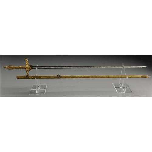 <B>1840 Pattern Medical Staff or Pay Department Sword.</B></I> Manufactured by Ames Manufacturing Company, Chicopee, Massachusetts, blade 30”, .75" wide at the hilt, 36½” overall to top of pommel, with scabbard, in very good condition. The 1840 pattern sword served double duty as both a Pay Department sword and Medical Staff sword. The blade is elliptical in cross section and etched on each side with floral sprays, military themes, American eagle with ribbon bearing the motto “E Pluribus Unum”, and caduceus. The grip is gilded brass with an oak leaf and acorn motif; on the obverse side is an oval medallion bearing an American eagle. The reverse side has a similar medallion left blank obviously intended to receive the owner's name. The pommel is shaped like a pineapple. The guard consists of floral motif quillons and two shields, one on the obverse and one on the reverse. The obverse shield is bordered with a floral motif within which are arranged 13 stars. The reverse shield is unadorned. The scabbard is gilded brass and engraved with floral decoration on the obverse side and is plain on the reverse side. There are two suspension rings present on the scabbard. The overall condition of this rare sword is very good with some wear to the gilt mainly on the grip, some age darkening to the blade, and a few dents (one which has slightly cracked the metal) to the scabbard and what appears to be an old solder repair to the lower suspension ring.<BR><BR><b>Shipping:</b> Requires 3rd Party Shipping (<a target="_blank" href="http://www.heritageauctions.com/common/shipping.php">view shipping information</a>)