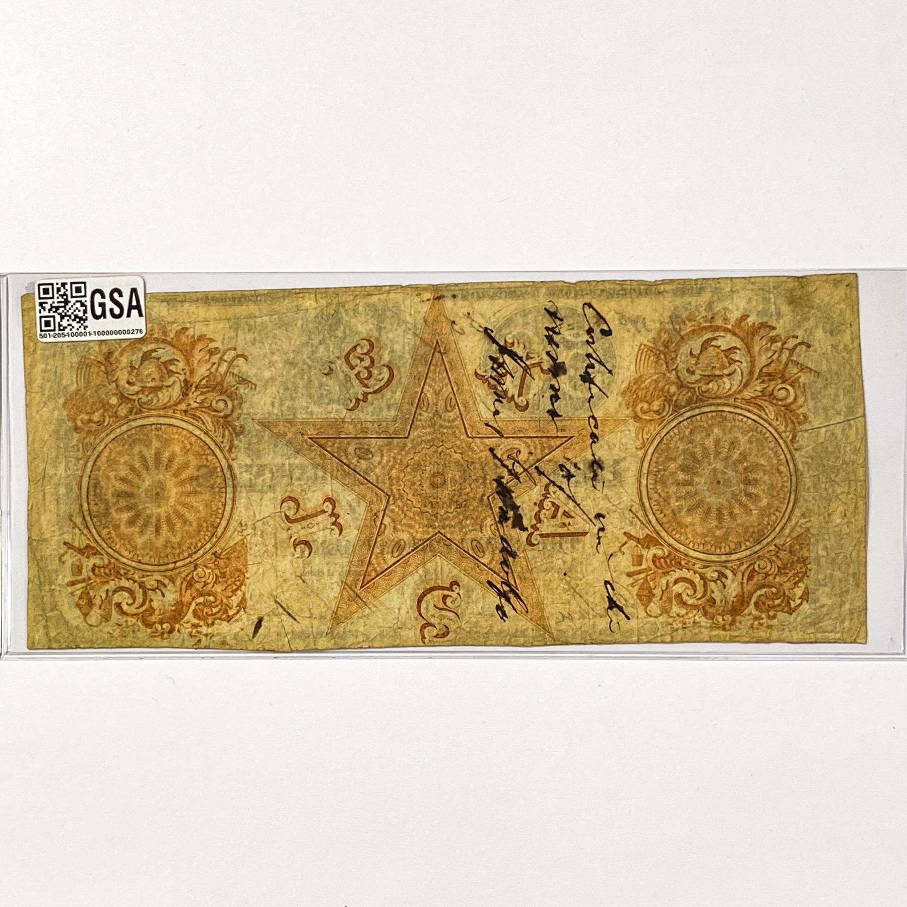 f. Notes sold referencing a third-party grading service are sold “AS IS” without any express or implied warranty, except for guarantee by GSA that they are genuine. Grading, condition or other attributes of any Product may have a material effect on its value and the opinion of others, including third-party grading services such as PCGS Currency and PMG may differ with that of GSA. GSA shall not be bound by any prior or subsequent opinion, determination, or certification by any grading service. Bidders specifically waive any claim to right of return of any Product because of the opinion, determination, or certification, or lack thereof, by any grading service. Certain warranties may be available from the grading services and Bidders are referred to them for further details: Paper Money Guaranty (PMG), PO Box 4711, Sarasota, FL 34230; PCGS Currency, PO Box 10470, Peoria, IL 61612-0470; PCGS Gold Shield, PO Box 9458, Newport Beach, CA 92658. Third-party graded notes are not returnable for any reason whatsoever.