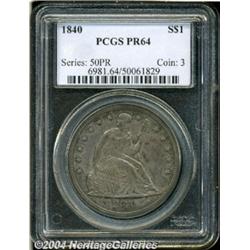 <B>1840<S$1> PR64 PCGS.</B></I> Struck from a previously unrecorded reverse die, with the following diagnostics:<BR><BR> 1. The first crossbar in the shield extends into the eagle's left (facing) wing.<BR><BR> 2. The final element of stripe 2, and the first and third elements of stripe 3 penetrate the innermost shield border.<BR><BR> 3. The final two elements of stripe 1 penetrate solidly to crossbar 5.<BR><BR> 4. The first element of stripe 2 penetrates to crossbar 2.<BR><BR>Breen (1977, 1988) describes two reverse dies for this issue: B-1, which Bowers (1993) does not credit, and B-2, with the following diagnostics:<BR><BR> 1. Two defects, joined, appear as projections on the right side of the final A in AMERICA.<BR><BR> 2. Each of the three elements in the vertical shield stripes extend into the crossbars with the sole exception of the final element in stripe 4.<BR><BR> 3. The final element of stripe 1 extends to crossbar 3.<BR><BR>Breen suggests that both originals and restrikes were made from this reverse die, which the Mint also used to produce most proof Seated Dollars dated 1841-1850, and at least one example of the proof 1852 (the ANS specimen).<BR> As we have previously handled two different proof 1840 Dollars struck from two distinct reverse dies, we do not know whether they are originals produced in 1840, or restrikes of a later date. A closer examination of other proof 1840 Seated Dollars, as well as other proof Silver Dollars of the 1840s-1850s is required before we can make a definite determination.<BR> This coin is struck from dies that show die rust throughout the reverse field. The absence of this feature in the field of the PR61 coin suggests that this near-Gem was struck at a later date. This is a richly toned example with olive and lavender-gray color over mottled electric-blue and orange-gold undertones. The reflective qualities are evident at a few angles, the crisply impressed devices are fully appreciable. Identifiable by an obverse lintmark that connects the two denticles below the 8 in the date.<BR> It has been suggested that the original mintage (61,005 pieces) of the 1840 Seated Dollar accounts for 61,000 business strikes and five proofs. Judging by current NGC and PCGS population data, however, it seems likely that the Mint produced more than five proof Silver Dollars in this, the first year of the type. The exact number of coins delivered is not known with certainty, but it seems probable, despite what Bowers says in his 1993 encyclopedia, that some of the examples extant are restrikes. Nevertheless, it is probable that no more than 20 proof Seated Dollars dated 1840 were produced. Some of the 34 coins known to NGC and PCGS (7/04) are highly likely resubmissions. <BR><BR><B>Important notice:</B> Heritage usually auctions material at the rate of 200-250 lots per hour. On some occasions eBay Live bid software or the Internet may not be able to keep up with the pace of the auction. We recommend placing a realistic absentee bid now as insurance to avoid disappointment. Occasionally the auctioneer may eliminate or reject an eBay Live bid, and the auctioneer may also reopen a lot after the close of the eBay live bidding (usually because we missed an audience bid), and may reject your bid even if it shows you as the winning bidder. By bidding via eBay Live, you agree that Heritage may award the lot to another bidder at its sole discretion under the circumstances described above or any other reasonable circumstances. Since eBay bids are not shown to us until we open the lot on the floor, we treat those bids just like floor bids. In most cases the floor responds before the eBay bid is presented to us, due to Internet lag time, so for consistency we have made it a policy that floor bids are always considered first over tie eBay live bids. Also please note that all Heritage lots purchased through eBay Live carry a 20% Buyer's Premium. Please make sure you read the Terms and Conditions before you bid. </span></font></tr></table></td></tr></table>
