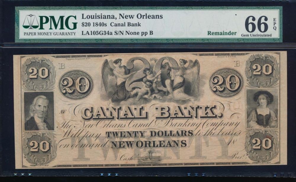 One 1840'S $20 New Orleans Canal Bank Note PMG 66EPQ.