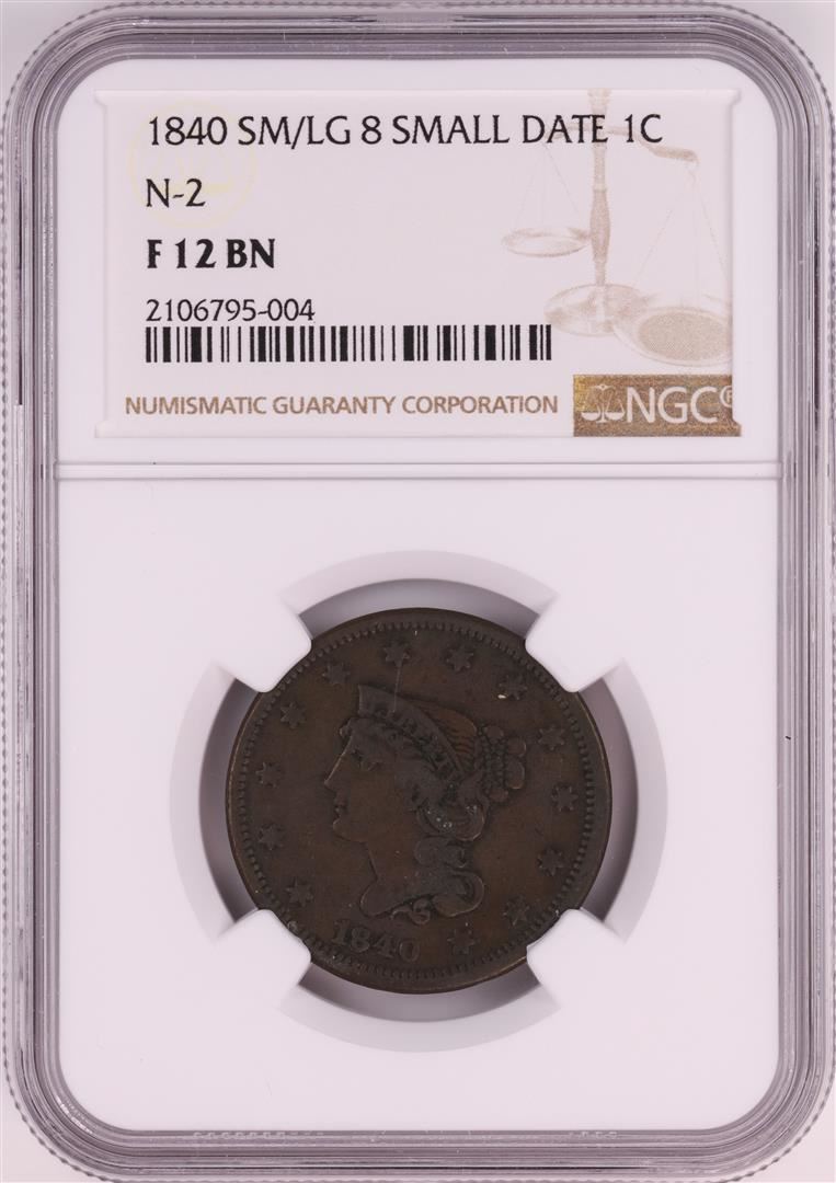 One 1840 SM/LG 8 Small Date N-2 Braided Hair Large Cent Coin NGC F12 BN. NGC Certified.