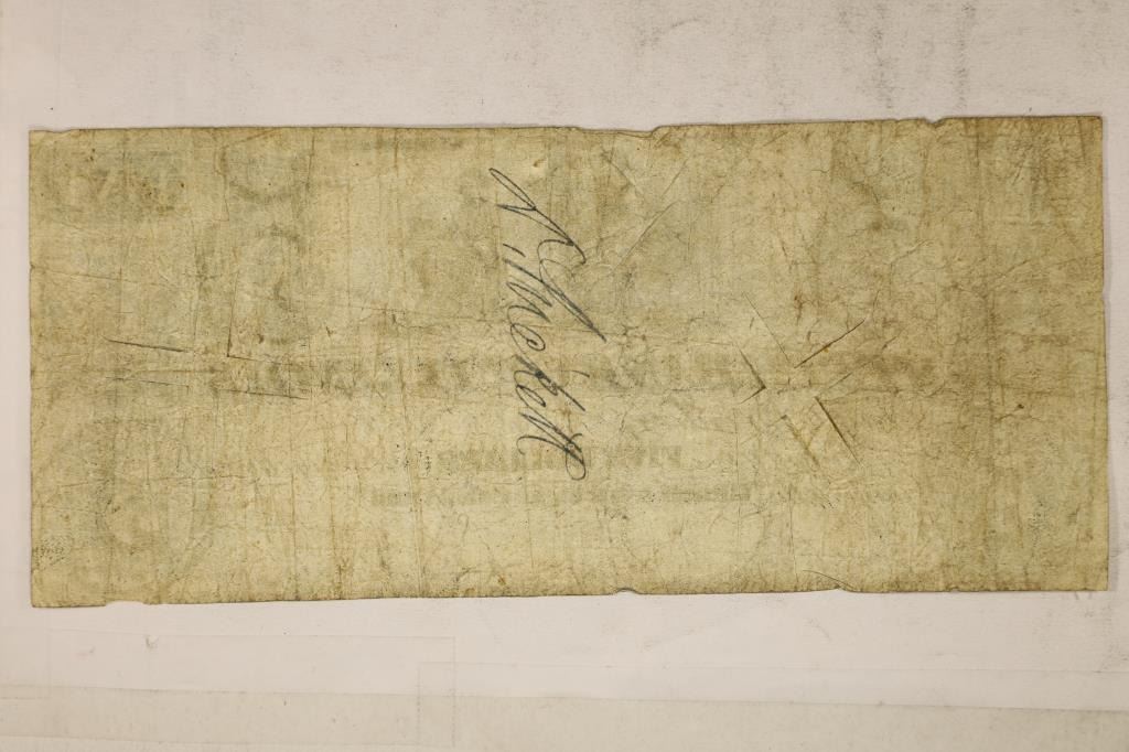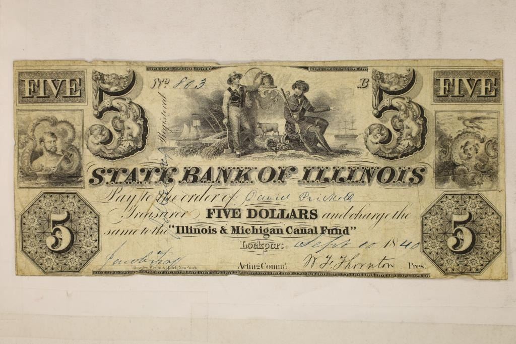 ILLINOIS AND MICHIGAN CANAL FUND $5 OBSOLETE BANK NOTE HAND SIGNED AND NUMBERED WITH CANCEL MARKS