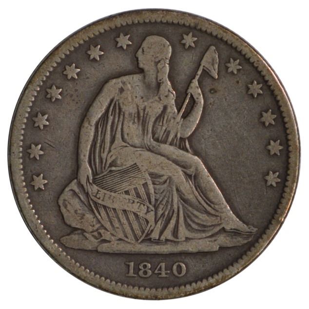 One 1840 Seated Liberty Small Letters Half Dollar Coin.