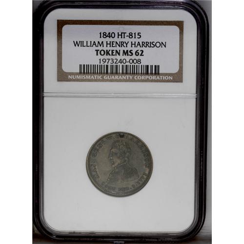 <B>1840 William Henry Harrison, HT-815,, DeWitt WHH 1840-54 MS62 NGC.</B></I> Copper. Deep brown patina and well detailed on each side. These purely political pieces were added to the series by Rulau with a special number notation. It is doubtful if any of these circulated as currency.<BR><I>From The Troy Wiseman Collection.</B></I>