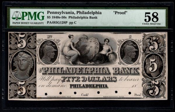 One 1840's-50's $5 Philadelphia Bank Note PMG 58.