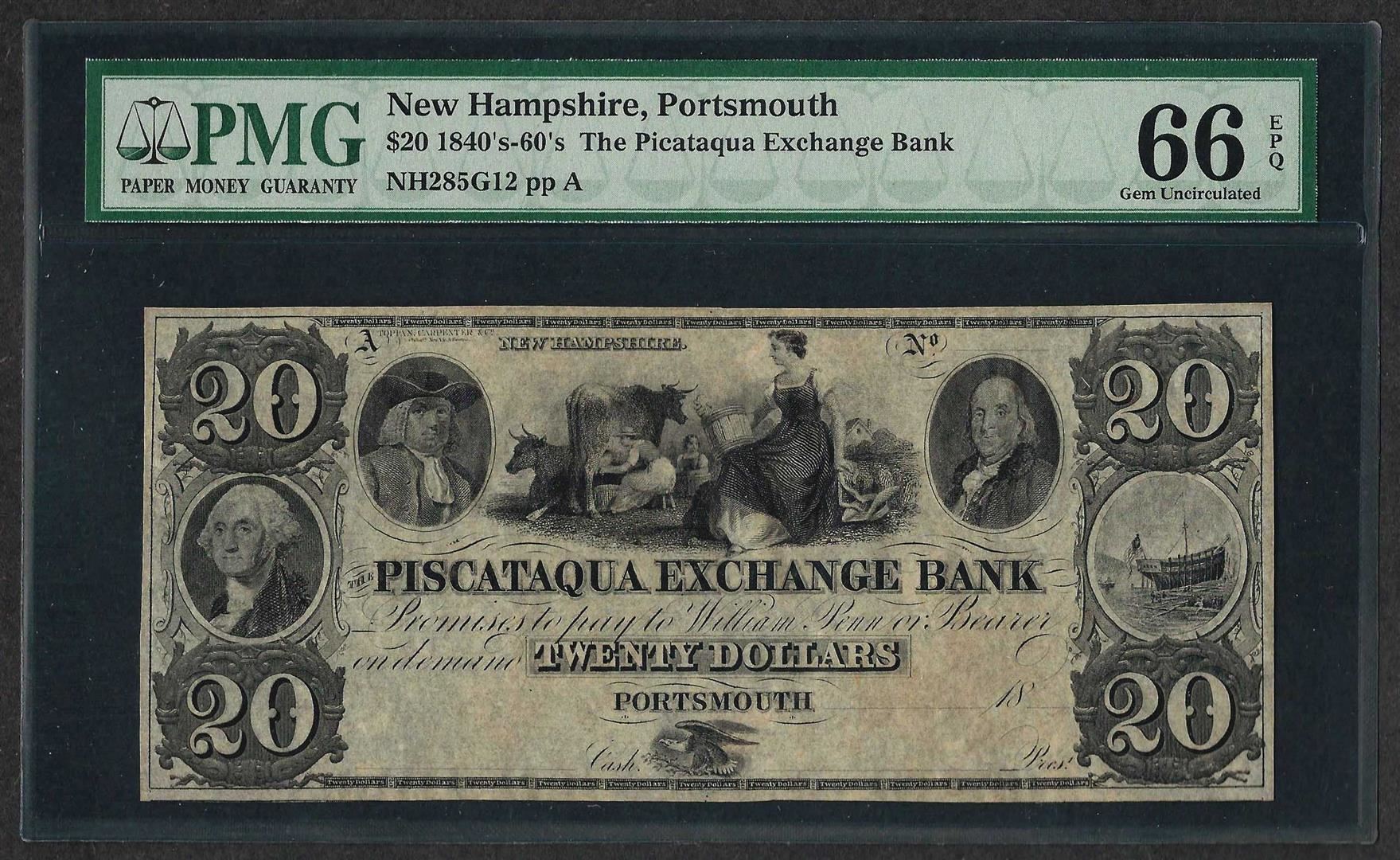 One 1840's-60's $20 The Picataqua Exchange Bank Obsolete Note PMG Gem Uncirculated 66EPQ. PMG Certified.