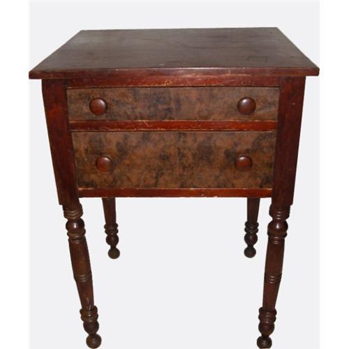 This is a very old and unique piece from the 1840's. It is made of cherry and has burl veneer on the front of its two drawers. The top drawer is divided into 5 sections (4 small compartments and 1 large). The bottom drawer has no dividers.